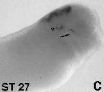 of Xenopus development. The whole mount in situ hybridization pattern of XATH-1 expression at Stage 22 (A) and Stage 27 (B, C) is