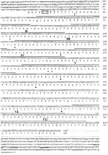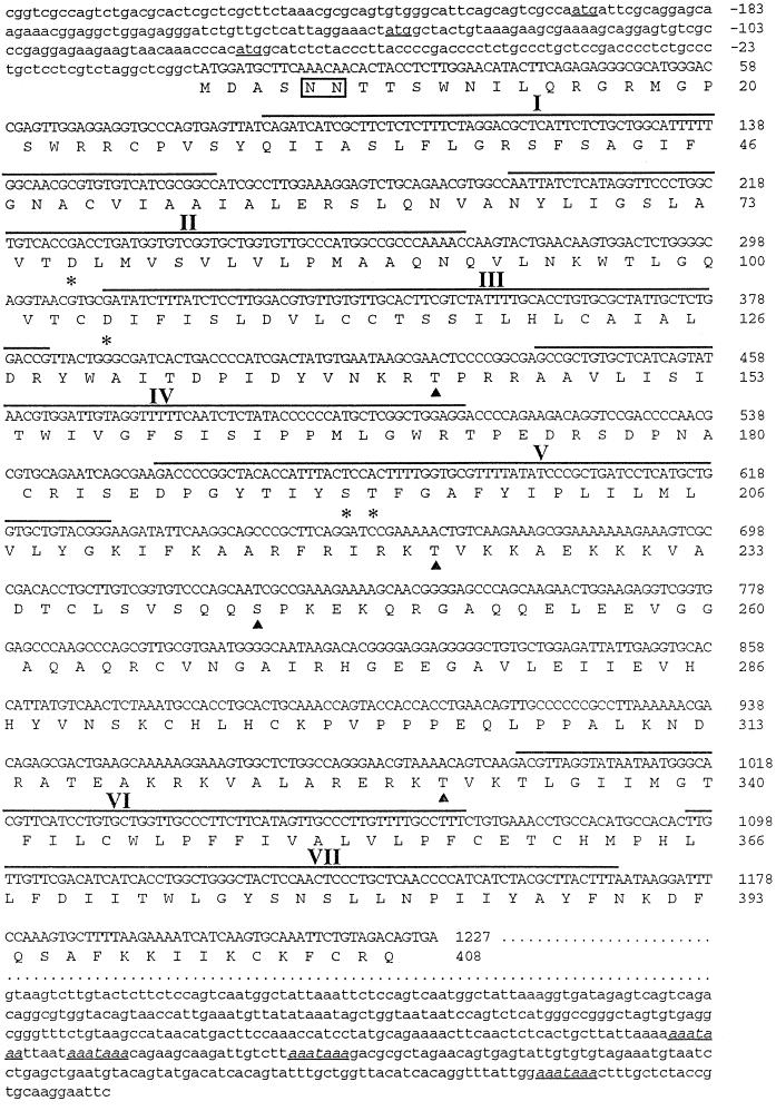 Fig. 1. Nucleotide and deduced amino-acid sequence of the X5-HT1A cDNA. The nucleotide coding sequence is shown in upper-case letters, non-coding sequence is shown in lower-case letters. The origin for coding sequence numbering is the first methionine of the open reading frame. Putative transmembrane regions are indicated by bars. Asparagine residues representing putative glycosylation sites are boxed. Potential phosphorylation sites are indicated by arrowheads. The asterisks denote the amino-acid residues considered to be important in ligand binding. The three AUG codons in the 5′ UTR are underlined. Four putative polyadenylation signals in the 3′ UTR are in italics and underlined. The dots following the first stop codon represent the 3′ UTR region not sequenced (≈300 bp). GenBank accession number: Y07901.