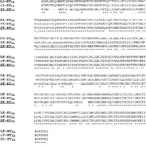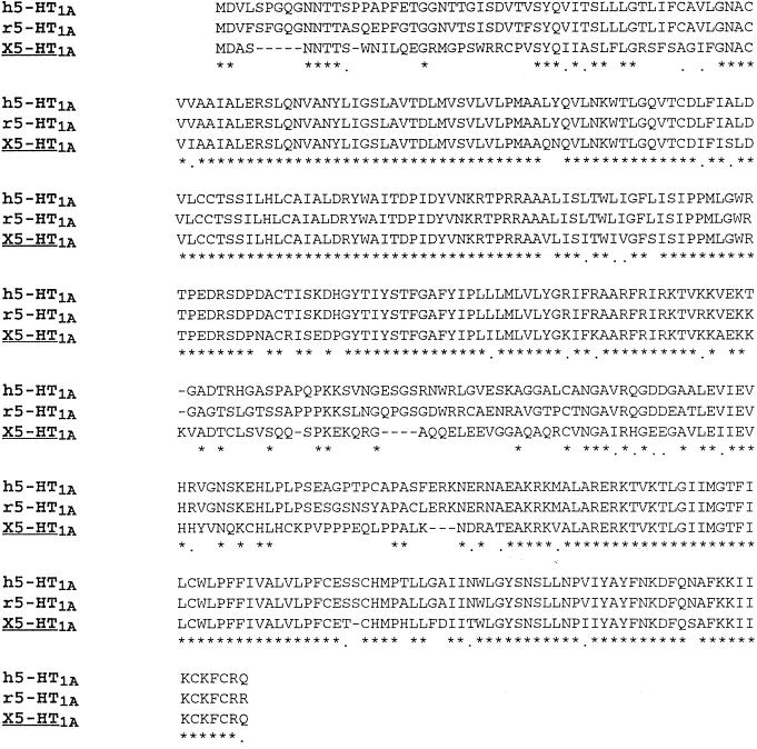 Fig. 2. Alignment of amino-acid sequence of X-5HT1A (below) and the human and rat 5-HT1A receptors (h5-HT1A and r5-HT1A) (above). The asterisks denote the amino-acid identity, the dots the similarity.