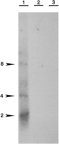 Fig. 3. Northern blot analysis of X5-HT1A receptor mRNA in Xenopus brain (lane 1), heart (lane 2) and liver (lane 3). Three mRNAs (2, 4 and 8 kb) are present only in the brain.