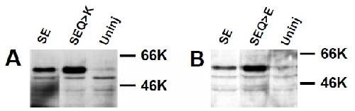 stage with (A) 5 pg of SE or 5 pg of SEQ>K mRNA, and (B) 10 pg