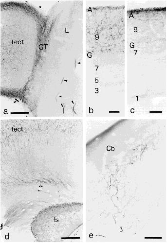 Distribution of choline acetyltransferase immunoreactivity in the brain of anuran (Rana perezi, Xenopus laevis) and urodele (Pleurodeles waltl) amphibians.