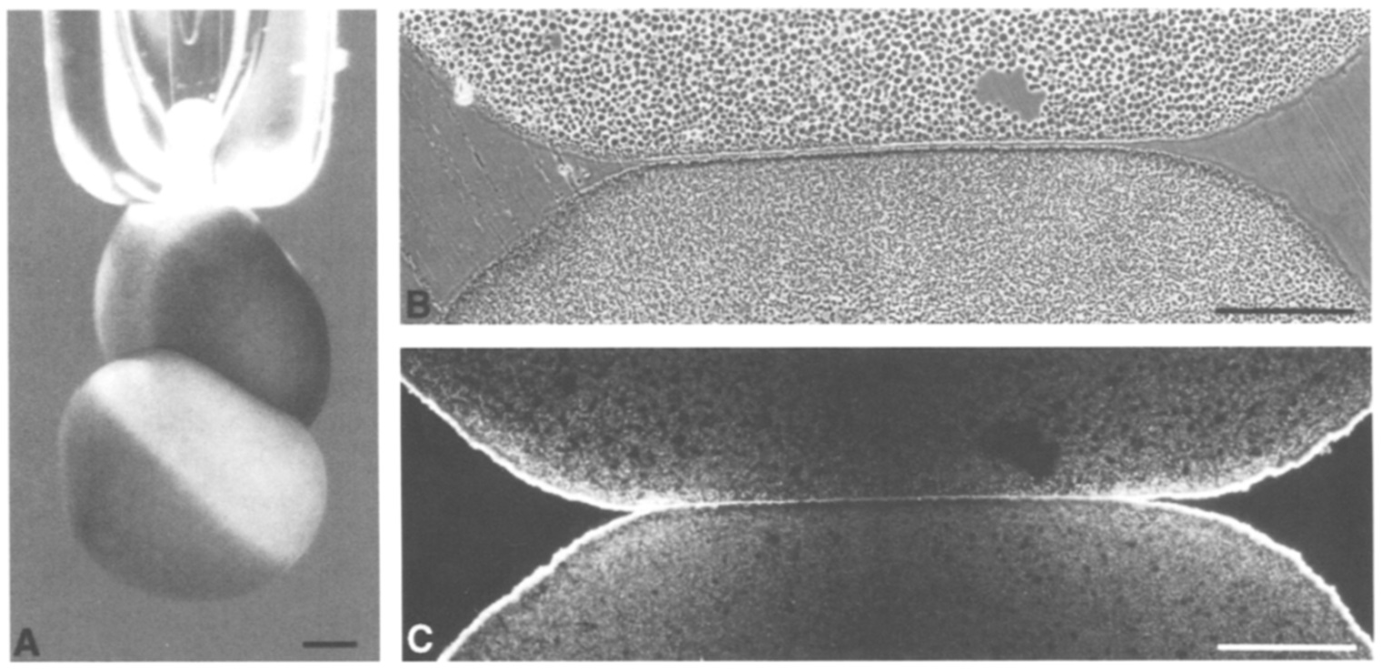 appeared superficially similar. (B,C) A phase contrast and an immunofluorescent image, respectively, of the contact site between two oocytes. The cadherins