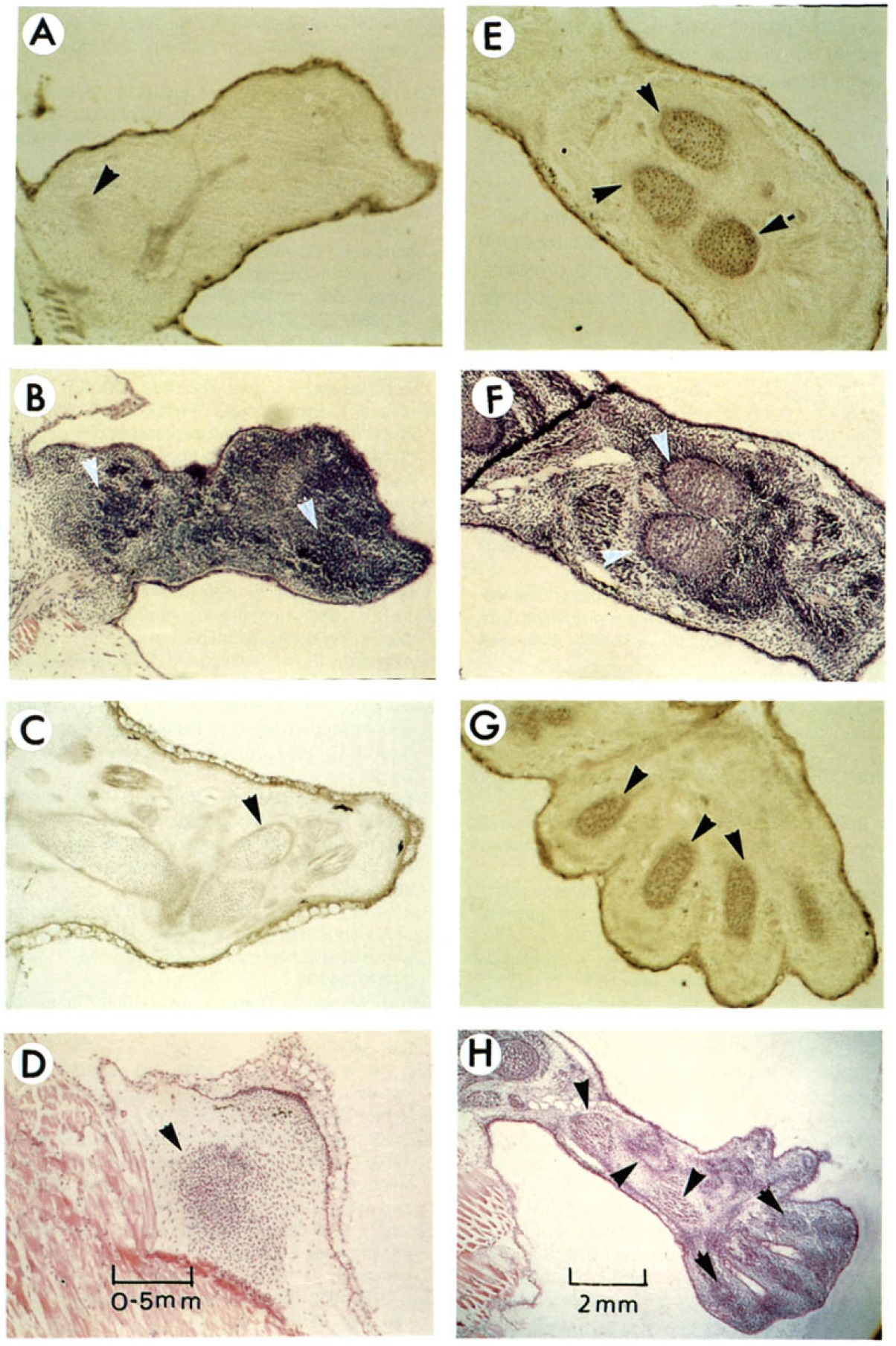 immunocytochemical localization of xTRB; (b,d,f,h) histochemical staining. Arrowheads indicate spatially restricted dense pockets of