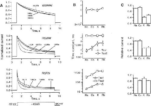 Kirsch, A single nonpolar residue in the deep pore of related K+ channels acts as a K+:Rb+ conductance switch. 1992, Pubmed