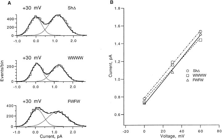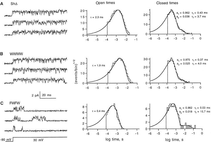 The mutation W434F produces an apparently complete block of potassium current in Shaker channels expressed in Xenopus oocytes. Tandem tetrameric constructs containing one or two subunits with this mutation showed rapid inactivation, although the NH2-terminal inactivation domain was absent from these constructs. The inactivation showed a selective dependence on external cations and was slowed by external TEA; these properties are characteristic of C-type inactivation. Inactivation was, however, incompletely relieved by hyperpolarization, suggesting the presence of a voltage-independent component. The hybrid channels had near-normal conductance and ion selectivity. Single-channel recordings from patches containing many W434F channels showed occasional channel openings, consistent with open probabilities of 10(-5) or less. We conclude that the W434F mutation produces a channel that is predominantly found in an inactivated state.