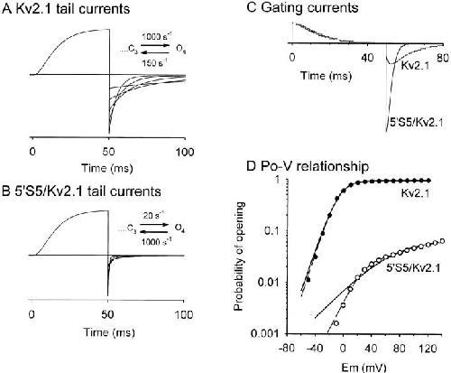 Figure 6. Numeric simulation of macroscopic currents in Kv2.1 and 5′S5/Kv2.1 using a sequential model. The effect of the mutation was assumed to be a destabilization of the open state caused by a sevenfold acceleration of the first closing step, O4→ C3, and a 50-fold slowing of the last opening step, C3→ O4. A and B show simulated tail currents, comparable to the actual records illustrated in Fig. 1. C and D show the predicted gating currents and Po-V relationships for the two channels. In D the smooth curves represent fits to single Boltzmann distributions with midpoint potentials (and slope factors) of −6 (11) and 68 (31.5) mV, respectively in Kv2.1 and 5′S5/Kv2.1. As indicated by the broken lines a better fit of the 5′S5/Kv2.1 data was obtained by using the sum of two Boltzmann distributions. |