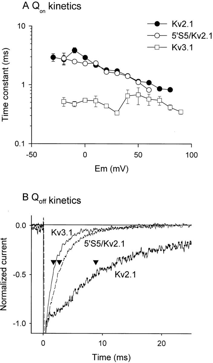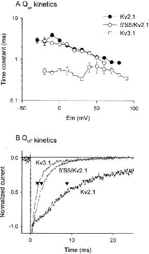 Figure 8. Mutations in 5′S5 selectively affect OFF gating current kinetics. A shows a semilogarithmic plot of the time constant of the major component of Ion decay in Kv2.1 ( filled circles), 5′S5/Kv2.1 (open squares), and Kv3.1 (open triangles) versus test potential. Time constants were obtained by fitting the decay phase of the on-gating current to a biexponential function and at each potential the time constant of the component that accounted for >90% of the decay was selected. Each symbol represents the average of 5–10 patches for each channel. B compares the time course of Ioff decay in peak-normalized Ioff records obtained from Kv3.1 (solid line), 5′S5/Kv2.1 (broken line), and Kv2.1 (dotted line) at a return potential of −90 mV after conditioning steps to produce near maximum activation (+60 mV for Kv3.1, 5′S5/Kv2.1 and +40 mV for Kv2.1). The arrowheads mark the time constants obtained by fitting the traces to monoexponential functions. The average time constants obtained from 5 to 10 membrane patches for each channel was 0.75 ± 0.15, 0.80 ± 0.51, and 8.10 ± 1.39 ms, respectively, in Kv3.1, 5′S5/Kv2.1, and Kv2.1. |