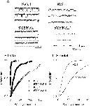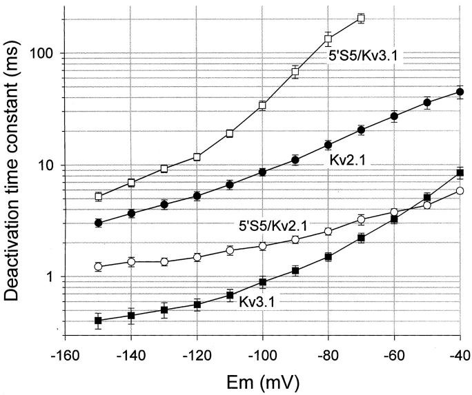 Figure 2. Voltage dependence of deactivation rate. Deactivation time constants were obtained by fitting the tail currents to monoexponential decay functions and were plotted semilogarithmically versus test potential: Kv2.1 ( filled circles), 5′S5/Kv2.1 (open circles), Kv3.1 ( filled squares), or 5′S5/Kv3.1 (open squares). The first 0.3 ms of the tail current was ignored during curve fitting to avoid limitations imposed by the clamp settling time. Each symbol represents average data from 5–10 membrane patches. |