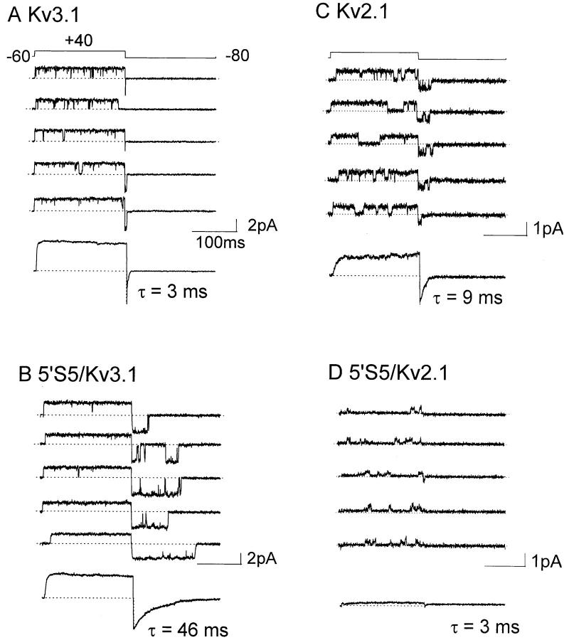 Figure 3. Effects of S5 mutations on single channel tail currents. Single-channel currents in Kv3.1 (A), 5′S5/Kv3.1 (B), Kv2.1 (C), and 5′S5/Kv2.1 (D) were recorded from cell-attached patches and the ensemble averages of 300–500 traces (except 5′S5, 128 traces). The patch membrane was pulsed to +40 mV for 200 ms and then returned to the holding potential of −80 mV. Pipette solution containing 60 mM NaCl and 60 mM KCl, and oocytes were bathed in a depolarizing isotonic KCl solution. |