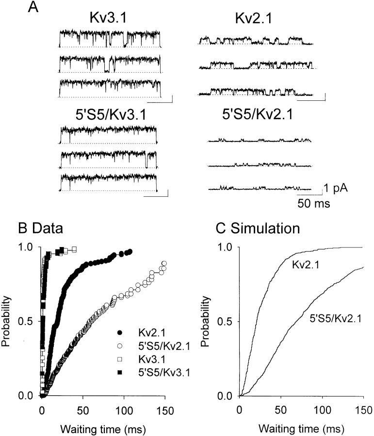 Figure 4. Cumulative first latency distributions. First latency distributions were obtained at +40 mV by patch-clamp single channel recording in the cell-attached mode. (A) Shows representative records in Kv3.1, 5′S5/Kv3.1, Kv2.1, and 5′S5/Kv2.1 channels. Pipette solution was normal Ringer containing 120 mM NaCl, and 2.5 mM KCl. Oocytes were bathed in a depolarizing isotonic KCl solution. (B) Shows the cumulative distribution of first latencies (from the representative experiments in A) at test potential +40 mV: Kv3.1 (open squares), 5′S5/Kv3.1 ( filled squares), Kv2.1 (f illed circles), and 5′S5/Kv2.1 (open circles), respectively. All data were obtained from single channel patches except 5′S5/Kv2.1 (3–8 channels/patch estimated from the maximum number of overlapping open channel events). These data were corrected (Aldrich et al., 1983) by taking the Nth root of the cumulative distribution (expressed as a survivor function, where N = 4, the estimated number of channels/patch in this experiment). As discussed in the text, because of the low Po of this mutant channel, the correction underestimates the slowing effect. (C) Compares the first latency distributions for Kv2.1 and 5′S5 obtained from the kinetic model described in Fig. 6. |