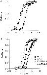 Figure 9. Voltage dependence of steady-state activation. Gating charge (A) was obtained from the time integral of Ion and was normalized to the maximal gating charge (Q max). Normalized charge was plotted versus test potential (Q-V) for Kv2.1 ( filled circles), 5′S5/Kv2.1 (open circles), and Kv3.1 ( filled squares). The conductance-voltage (G-V) relationship (B) was obtained by normalizing ionic conductances at each test potential by the maximal conductance. Normalized conductance was plotted for 5′S5/Kv3.1 (open squares), Kv2.1 ( filled circles), Kv3.1 ( filled squares), and 5′S5/Kv2.1 (open circles). Both Q-V and G-V data were fit to single Boltzmann functions (smooth curves). Data were pooled from >5 experiments (patches or oocytes, respectively, in A and B). For Kv2.1 the midpoint (V0.5) potentials were 10 and −25 mV, respectively for the G-V and Q-V curves, whereas V0.5 values for Kv3.1 were 20 and 0.9 mV. The midpoint of the Q-V curve for the 5′S5/Kv2.1 chimera was nearly identical to that of Kv2.1 (V0.5 = −22 mV), but the G-V curve (B; V0.5 = 22 mV) was shifted toward that of Kv3.1. The valence z for the gating charge (obtained from the slope of the Q-V curve) was the same in both Kv2.1 and the 5′S5/Kv2.1 chimera. |