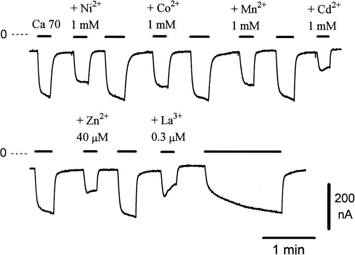 A monovalent cationic conductance that is blocked by extracellular divalent cations in Xenopus oocytes.