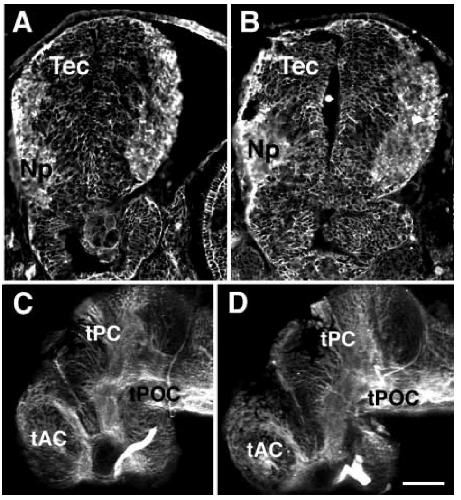 Fig. 5. Gross organization of neuroepithelium is unchanged by heparin treatment. Embryos were exposed to either control or heparin solutions (0.1 mg/ml) at stage 33/34 and examined at stage 40. (A,B) Confocal images of control (A) and heparin (B) treated brain sections stained with anti-NCAM. NCAM is abundant in the neuropil (Np) as well as in the neuroepithelium and is unaffected by heparin treatment. Tec, tectum, exposed side is to the left, dorsal is up. Scale bar, 50 μm. (C,D) Major axonal tracts are not changed by heparin treatment as seen with anti-acetylated tubulin staining in wholemount control (C) and heparin-treated (D) brains. tAC, tract of the anterior commissure; tPC, tract of the posterior commissure; tPOC, tract of the post-optic commissure. Dorsal is up, anterior to the left. Scale bar, 100 μm.