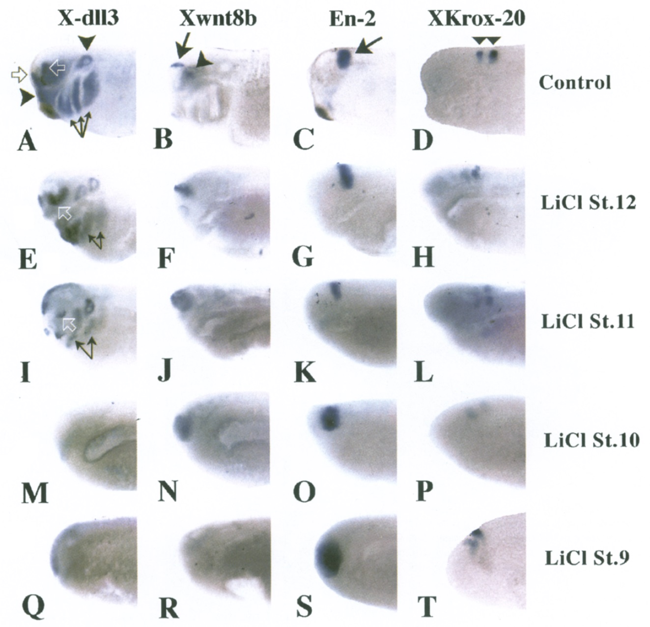 embryos or embryos treated with lithium at stages 9-12 (as indicated to the right of each row) were cultured to the tailbud stage (stage