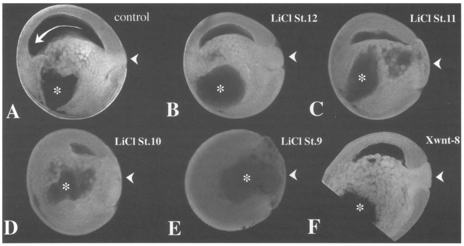 confocal images of an untreated embryo (A) and of embryos treated with lithium at stage 12 (B), 11 (C), 10 (D), or 9 (E) or made to