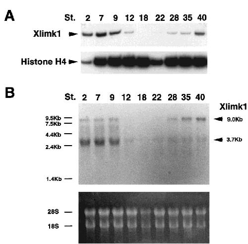 The LIM double zinc finger motif locates in several developmentally functioning and cytoskeletal proteins, and is considered to act as a specific motif for protein-protein interactions. LIM kinase (LIMK) is a novel protein kinase containing two LIM motifs at the N-terminal, the function of which has yet to be clearly defined. In this study, we cloned a cDNA encoding Xenopus counterpart of human LIMK1 gene by RT-PCR mediated cloning, and designated in Xlimk1. Xlimk1 is highly homologous to mammalian LIMK1 in each structural domain, particularly in LIM and protein kinase domains. In Northern blot analysis, two distinct Xlimk1 transcripts of 9.0 Kb and 3.7 Kb were present in early cleavage stages of the embryo. Both mRNA species were subsequently decreased at the gastrula stages. The 9.0 Kb of Xlimk1 mRNA again appeared in late neurula stage, then the expression level gradually increased in later stages of the embryo. Whole-mount in situ hybridization analysis showed the localization of Xlimk1 transcripts in the animal half of the blastula embryo. In post-neurula stages, specific signals for Xlimk1 were predominant in the anterior (head) region of the embryo, including developing brain, hyoid and branchial arches, and anlagen of sensory organs. These results indicate that Xlimk1 may play an important role in neural development and formation of anterior (head) structures in the Xenopus embryo.