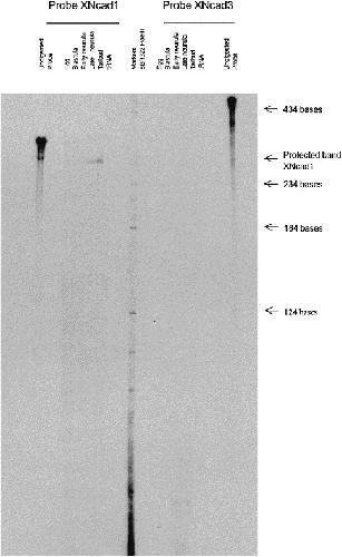 Fig. 3. Expression of XNcad1 and XNcad3 in developing embryos. 20 μg of total RNA from a series of developing embryos were used in an RNase protection analysis with radiolabelled synthetic RNA gene specific probes as described in the text.