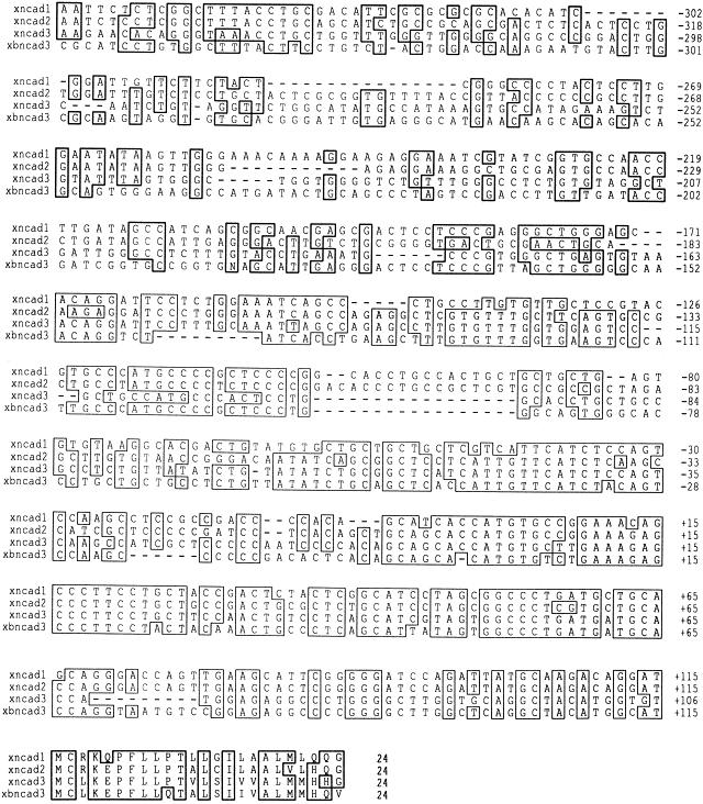 Fig. 1. Blocks 1–10: multiple nucleotide sequence alignment of XNcad1, XNcad2, XNcad3 and XBNcad3 using the GCG package. The first base of the initiation codon is numbered as +1. Bases conserved between the sequences are boxed. Bottom block: multiple amino acid sequence alignment of the proteins encoded by XNcad1, XNcad2, XNcad3 and XBNcad3 using the GCG package. The alignment begins from the initiating methionine. Amino acids conserved between the sequences are boxed.