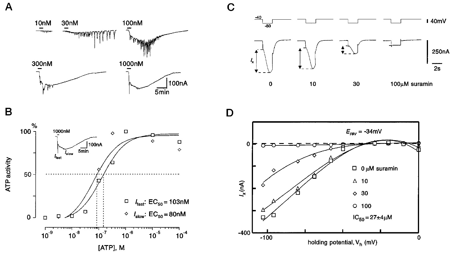 responses evoked by ATP (1 mM). Each data point is the mean of three observations. C, membrane currents showing a time- and voltage-dependent