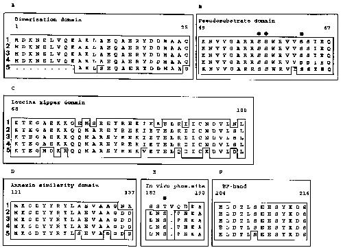 Seqnet Series). (.) represent gaps introduced by the computer program to improve alignment. Putative phosphorylation sites are indicated by