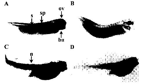 D) early tadpole (stage 45) probed with antisense and sense transcripts, respectively, ba, branchial arches; n, notochord; ov, optic vesicles; s,