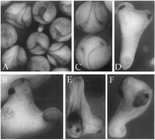 FIG. 2. Axis duplication illustrated. Injection of RNA encoding HPkg-myc (A) leads to the appearance of duplicated and occasionally