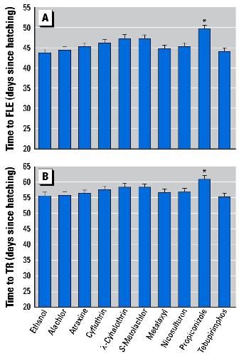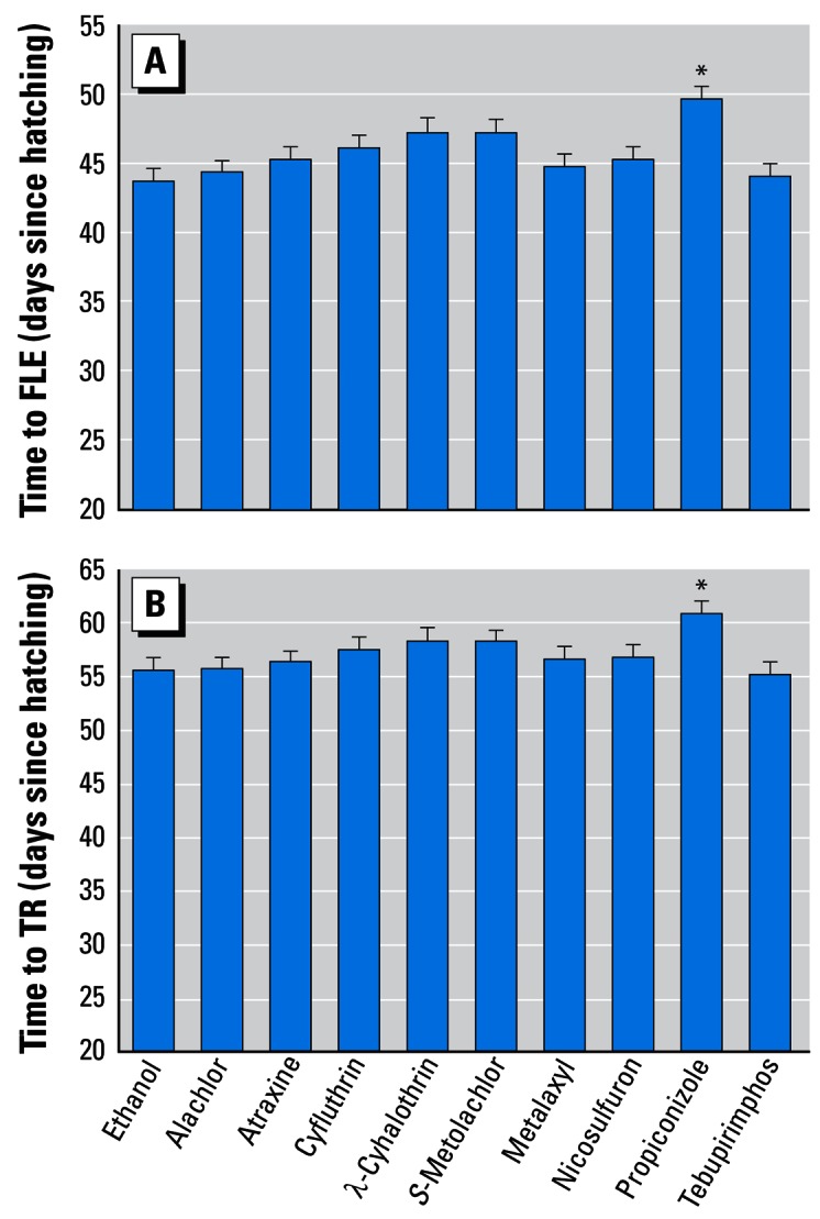 Figure 1. Effect of single pesticides (0.1 ppb each) on time to initiate metamorphosis (FLE; A) and time to complete metamorphosis (TR; B). Error bars show SEM.*Statistically significant groups (ANOVA, p < 0.05). |