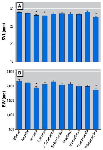 Figure 3. Effect of single pesticides (0.1 ppb each) on SVL (A) and BW (B). Error bars show SEM.*Statistically significant groups (ANOVA, p < 0.05). |