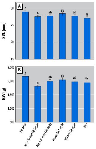 Figure 4. Effect of pesticide mixtures on SVL) (A) and BW(B). Abbreviations: Atr, atrazine; Bicep, Bicep II Magnum; S-met, S-metolachlor; Mix, nine-chemical mixture (0.1 ppb each pesticide). Letters above bars show statistical groupings. Error bars show SEM. |