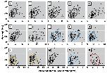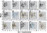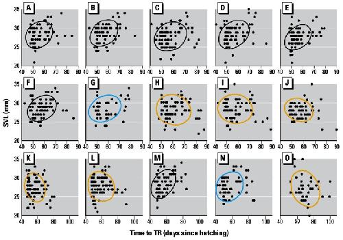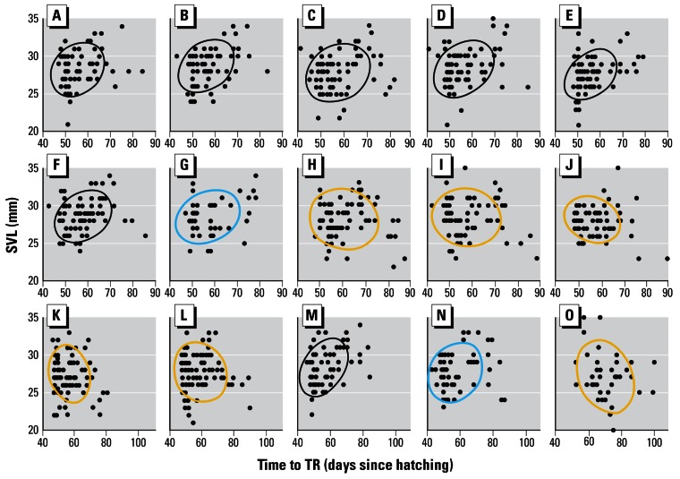 Figure 5. Correlational analysis of time to complete TR and SVL. Results are shown for single pesticides (0.1 ppb) in A–J and for mixtures (K–O). For the x-axis, the scales for A–J are identical, but note the difference in scale for the mixtures as a result of the delay in metamorphosis in the animals treated with the nine-compound mixture (O). Results are shown for ethanol (A), alachlor (B), cyfluthrin (C), nicosulfuron (D), tebupirimphos (E), S-metolachlor (F), metalaxyl (G), propiconizole (H), λ-cyhalothrin (I), atrazine (J), 0.1 ppb atrazine + S-metolachlor (K), 10 ppb atrazine + S-metolachlor (L), 0.1 ppb Bicep II Magnum (M), 10 ppb Bicep II Magnum (N), and the nine-compound mixture (O). Ellipses show Gaussian bivariate confidence limits. Ellipses are color-coded: black, a positive and significant correlation; blue, a positive but nonsignificant correlation; yellow, a negative but nonsignificant correlation. Significance (p ≤ 0.05) was determined by Bonferroni probabilities and based on Spearmen rank order correlation coefficients. Sample size (as reported in Table 1) cannot be determined from the number of data points due to overlapping data. |
