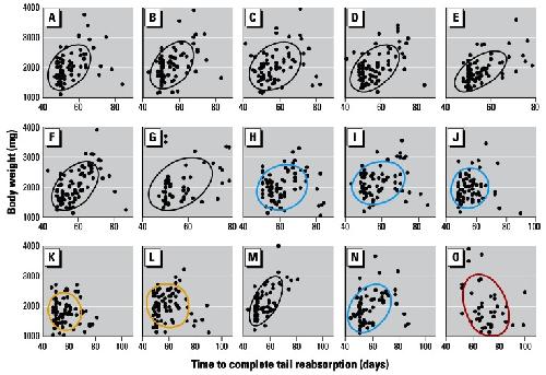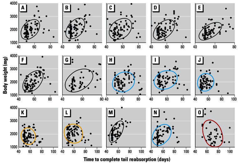 Figure 6. Correlational analysis of time to complete TR and BW. Results are shown for single pesticides (0.1 ppb) in A–J and for mixtures (K–O). For the x-axis, the scales for the top two rows are identical, but note the difference in scale for the mixtures as a result of the delay in metamorphosis in the animals treated with the nine-compound mixture (O). Results are shown for ethanol (A), alachlor (B), cyfluthrin (C), nicosulfuron (D), tebupirimphos (E), S-metolachlor (F), metalaxyl (G), propiconizole (H), λ-cyhalothrin (I), and atrazine (J), 0.1 ppb atrazine + S-metolachlor (K), 10 ppb atrazine + S-metolachlor (L), 0.1 ppb Bicep II Magnum (M), 10 ppb Bicep II Magnum (N), and the nine-compound mixture (O). Ellipses show Gaussian bivariate confidence limits. Ellipses are color-coded: black, a positive and significant correlation; blue, a positive but nonsignificant correlation; yellow, a negative but nonsignificant correlation; red, a negative and significant correlation. Significance (p ≤ 0.05) was determined by Bonferroni probabilities and based on Spearmen rank order correlation coefficients. Sample size (as reported in Table 2) cannot be determined from the number of data points because of overlapping data. |