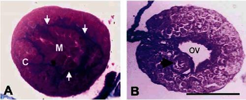 Figure 7. Histological transverse cross-section (8 μm) of presumptive male (A) and female (B) leopard frog (R. pipiens) at metamorphosis (Gosner stage 46). Gonads are not completely differentiated. Note the intact cortex (C) and medulla (M) separated by blue connective tissue (arrows in A). Also note medullary regression and ovarian vesicle (OV) but absence of significant oogenesis in the female (B). A single oocyte (arrow) is noted in the female. Scale bar = 125 μm. |