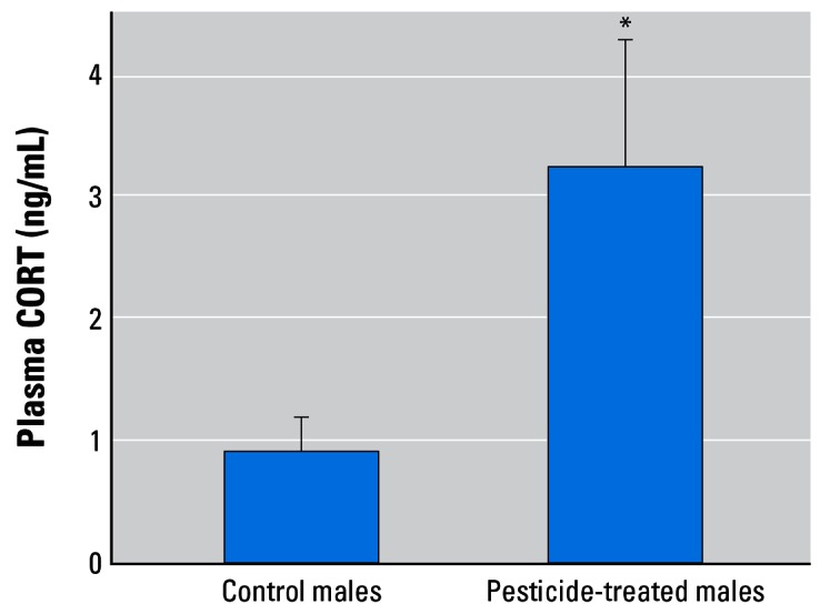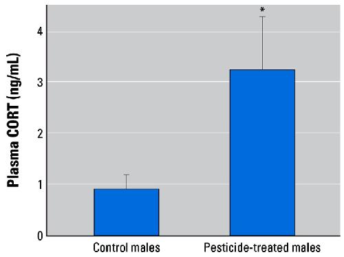 Figure 10. Effect of the pesticide mixture on plasma corticosterone levels in adult male African clawed frogs (X. laevis). Error bars show SEM.*Statistical significance (p < 0.05). |
