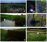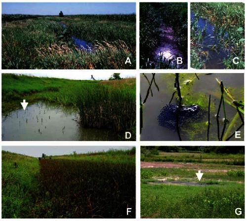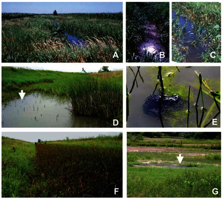 Figure 11. Field 413 (40°55.88 N, 97°22.38 W), York County, Nebraska (A–F). In 2001 frogs bred in the irrigation ditch (A) and were present by the thousands. Even at this time, the water level (and thus temperature and pesticide levels) fluctuated drastically from one day to the next: the photo in B was taken on 22 July 2001 and photos in A and C were taken on 23 July 2001. (B) All the water has evaporated and only the small pool (white glare) remains. In 2004 seven pairs of frogs bred at the same site when the irrigation ditch filled with rainwater and snowmelt (D; arrow indicates where frog clutches were found). (E) One of the seven clutches. (F) The fields around the irrigation ditch were not planted in 2003 or 2004, and the ditch dried up, resulting in 100% failure of the population at this site for the second year since initial collection. (G) A breeding pond (arrow) in Hitchcock County, Nebraska (40°08.433 N, 101°13.804 W) along the Republican River. All the tadpoles died of desiccation at this site, further illustrating the interaction between pesticides that slow development and delay metamorphosis and the impact of agriculture (and irrigation practices) on amphibian populations. |