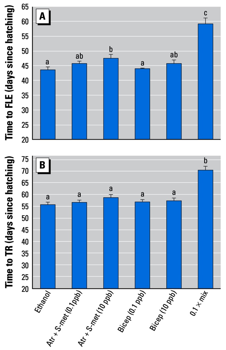Figure 2. Effect of pesticide mixtures on time to initiate metamorphosis (FLE; A) and time to complete metamorphosis (TR; B). Abbreviations: Atr, atrazine; Bicep, Bicep II Magnum; S-Met, S-metolachlor; Mix, nine-chemical mixture (0.1 ppb each pesticide). Letters above bars indicate statistical groupings. Error bars show SEM.*Statistically significant groups (ANOVA, p < 0.05). |