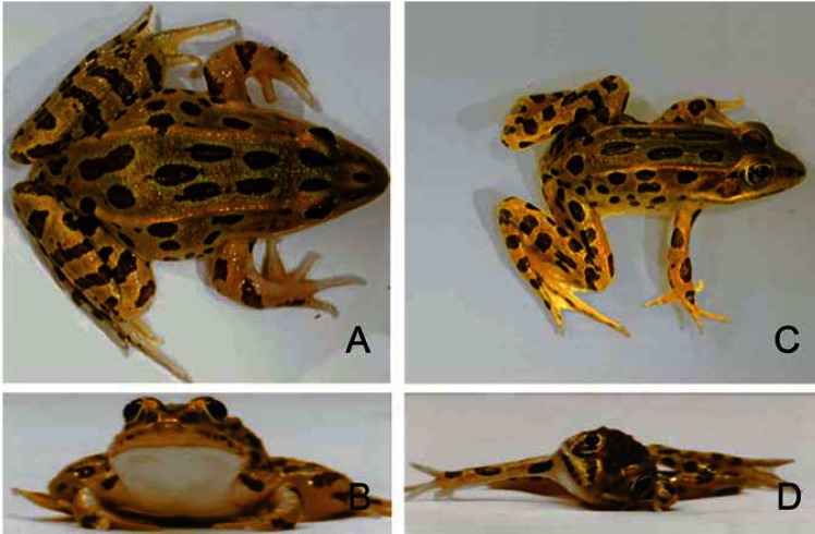 Figure 8. Dorsal (A,C) and frontal (B,D) view of newly metamorphosed (Gosner stage 46) control (A,B) R. pipiens and similar-aged animal exposed to the nine-pesticide mixture (C,D). Control animal is in good body condition as expected. The pesticide-treated animal is in poor body condition because of a generalized gram-negative bacterial infection. The pathogen was identified in control and treated frogs, but only pesticide-exposed animals show signs of disease: head tilt, unilateral extensor muscle rigidity, anisocoria, and intermittent recumbency due to a severe otitis interna and meningitis. This presentation is consistent with C. menigosepticum infection, a stress-induced disease of frogs. |