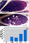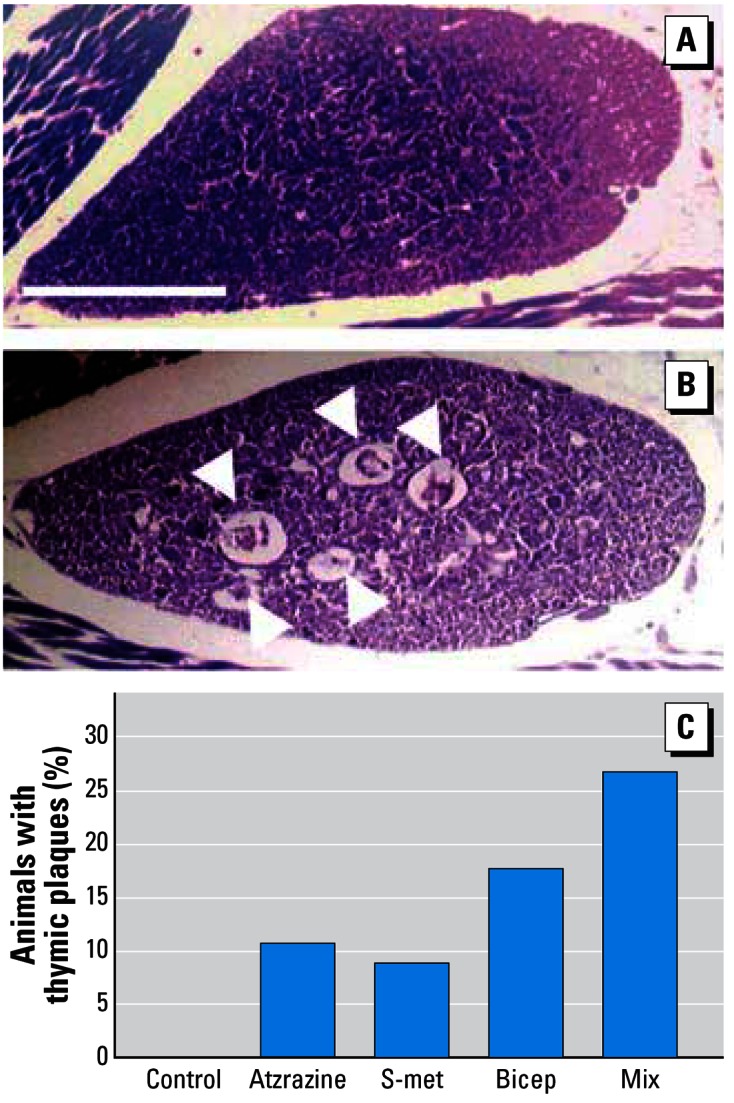 Figure 9. Representative transverse cross-section through the thymus of a control animal (A) and (B) an animal treated with the nine-compound pesticide mixture. (C) The frequency of animals with detectable damage to the thymus. No control animals showed damage to the thymus. Animals exposed to 0.1 ppb atrazine or to S-metolachlor (S-met) had damage as shown in B, with increasing frequencies of damage with exposure to Bicep II Magnum (atrazine + metolachlor, given to concentration of 0.1 ppb atrazine), and maximum damage with exposure to the pesticide mixture (Mix). Histological sections were 4 μm stained in Mallory’s trichrome stain. Scale bar = 0.5 mm for A and B. |