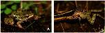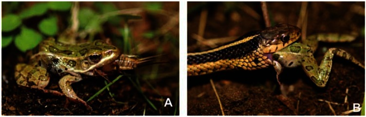 Figure 12. Demonstration of the effects of decreased size at metamorphosis on amphibians. (A) Newly metamorphosed leopard frog (R. pipiens) attempting to ingest a cricket that is too large (frog is 3.3 cm SVL; cricket is 2.1 cm long). (B) A 67-cm-long garter snake (Thamnophis sirtalis) feeding on a newly metamorphosed 3.2-cm-long leopard frog (R. pipiens). Frogs are gape-limited predators and less likely to find appropriate food when size at metamorphosis is reduced by pesticides. Similarly, garter snakes (like all snakes) are gape-limited predators, so smaller frogs are more vulnerable to snake predation. |
