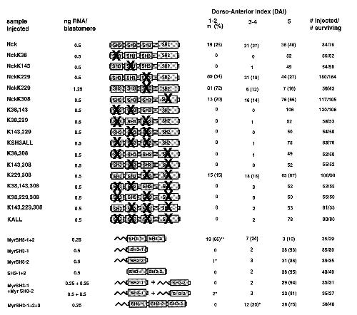Figure 2 Ventralization induced by expression of Nck constructs. The structure of proteins encoded by microinjected RNAs is represented. Synthetic mRNA was injected into marginal zone region of the two dorsal blastomeres at four-cell stage. Phenotypes were scored morphologically at stage 36 according to the dorso-anterior index described previously (26). SH2 and SH3 domains are represented by shaded boxes; mutant domains in which ligand binding activity was ablated are indicated by large âXâ on diagram. Amino acid number of residues substituted by lysine (K) is indicated on left. For truncation mutants (Bottom), number in shaded box indicates first, second, or third SH3 domain. Wavy line, myristoylation signal. ââ, 10 embryos (10 of 19) also had âsplit tailâ resulting from incomplete closure of the blastopore. â, All embryos had âsplit tail.â