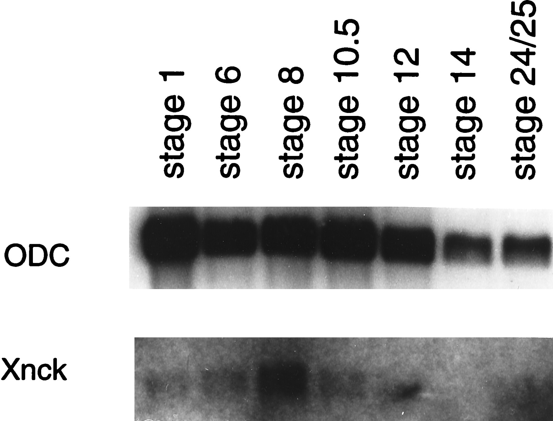 Figure 1 Xenopus Nck mRNA expression during embryonic development. Equal amounts of poly(A)+ RNA extracted from embryos at stage indicated above were loaded in each lane and blot was hybridized to full-length Xenopus Nck cDNA probe. Hybridization with ornithine decarboxylase (ODC) riboprobe (Top) is a control for RNA loading.