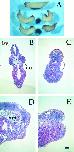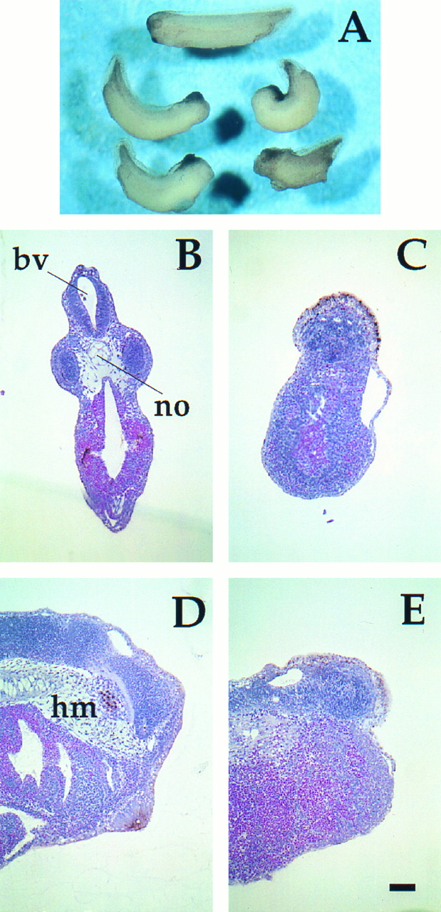 Figure 3 Nck K229 interferes with head and anterior notochord development. (A) Phenotype of embryos microinjected with KALL control mRNA (top embryo) or K229 mRNA (bottom four embryos) as in Fig. 2 legend. (BâE) Histological analysis of KALL-injected control embryos (B and D) and K229-injected embryos (C and E). Embryos were fixed at stage 36, sectioned, and stained with hematoxylin/eosin. (B and C) Transverse sections at the level of the eye in the control embryo. Note absence of notochord (no), headmesenchyme and brainventricle (bv) in C. (D and E) Sagittal (midline) sections. Note absence of headmesenchyme (hm) and anterior notochord in E. (Bar = 100 μm.)