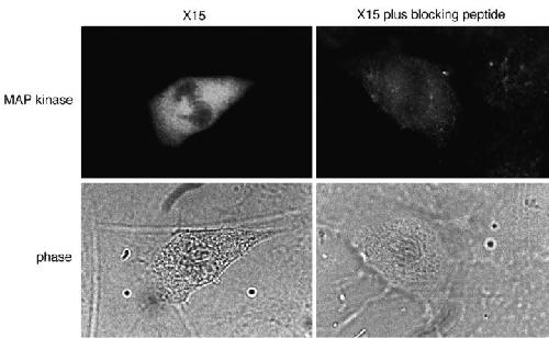 Figure 3. Single label immunolocalization of MAP kinase. XTC cells were fixed, permeabilized, stained with DAPI (not shown) and X15 or X15 plus blocking peptide (35 μM), and examined by fluorescence and phase microscopy. The cell shown is in metaphase.
