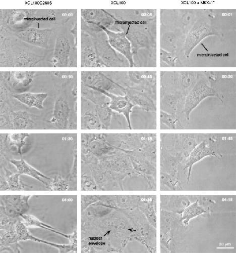 Figure 5. Effects of perturbing MAP kinase function on the spindle assembly checkpoint. Mitotic cells were microinjected with the inactive XCL100 C260S mutant (left), wild-type XCL100 (middle), or XCL100 plus MKK-1* (right), and then treated with nocodazole. The morphological consequences were assessed by time-lapse video microscopy. Four images are shown from each video series. Numbers in each panel denote the time (in h and min) after nocodazole treatment.