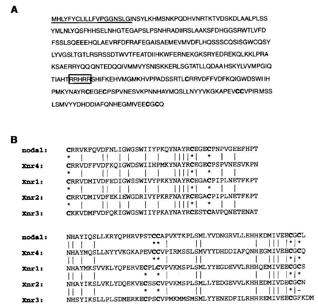 residues in the mature region are shown in bold typeface. (B) A lineup of the amino acids of mature Xnr4 with those of mouse nodal and