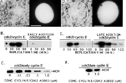 Figure 2. High concentrations of cdk2–cyclin E inhibits both DNA replication and the binding of MCM3 to chromatin. (A) Purified egg cytosol containing 1 μM of added cdk2–cyclin E was preincubated for 30 min. After this incubation, membrane and sperm (1,000/μl) were added to the extract. As shown, by using phase optics (left), these sperm formed intact nuclei, and by fluorescent staining (right), the DNA decondensed. (B) Interphase cytosol was preincubated alone (− cdk2–cyclin E), or with 1 μM of cdk2– cyclin E (cdk2–Cyclin E) for 30 min. After this membrane and 1,000 sperm/μl were added. The autoradiogram shows 32P incorporated into DNA during 15 min pulses starting at indicated times after sperm addition. In the absence of cyclin E, replication occurred normally, while in the presence of cyclin E it was strongly inhibited at all time points. (C) cdk2–cyclin E was added to interphase cytosol to the final concentrations indicated. After a 30-min incubation, 1,000 sperm/μl were added to each reaction, the reactions were incubated for another 30 min, and then the sperm were pelleted. The pellets were resuspended in SDS-PAGE sample buffer. MCM3 bound to the sperm chromatin was determined by Western blotting using anti-MCM3 antibody. As shown, MCM3 binding to chromatin was inhibited as the concentration of cdk2–cyclin E increased from 0.12 to 1.0 μM. (D) Interphase cytosol was first incubated with 1,000 sperm/μl for 30 min. 1 μM of cdk2–cyclin E was then added together with membrane. Photographs show a typical nucleus that formed under these conditions. (E) Interphase cytosol was first incubated with 1,000 sperm/μl for 30 min. After this, membrane was added with or without 1 μM of cdk2–cyclin E and DNA replication was assayed as in B. Replication in both extracts was identical, demonstrating that late addition of cdk2–cyclin E does not inhibit chromatin from replicating. (F) Sperm was added to cytosol to a final concentration of 1,000 sperm/μl. After a 30-min incubation, the indicated amounts of cdk2–cyclin E were added, and the reaction was incubated for another 30 min. At the end of the incubation the sperm were pelleted and assayed for MCM3 by Western blotting as described in C. As shown, late addition of cdk2–cyclin E does not inhibit binding of MCM3 to chromatin. Bars: (A and D) 10 μm.