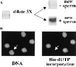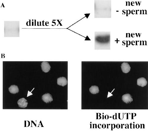 Figure 5. Nuclei assembled in the presence of high cdk2–cyclin E fail to initiate DNA replication when the cytosol is diluted. (A) Interphase cytosol was first incubated with 1 μM of cdk2–cyclin E for 30 min. After this preincubation, sperm chromatin (1,000 sperm/μl) and membrane were added. Aliquots were removed and incubated with [32P]dATP to determine early replication (left). As expected, high cdk2–cyclin E concentration blocked replication. The remainder of the mixture was incubated for a further 60 min and then diluted with 4 vol of fresh extract containing both cytosol and membrane but lacking cdk2–cyclin E. The diluted reaction was then divided in half, and new sperm chromatin (1,000/μl) was added to one half. Radioactively labeled dATP was then added to both reactions, and DNA replication was assayed after a further 60-min incubation. Nuclei assembled in the presence of high cdk2–cyclin E concentrations failed to replicate after dilution of the extract (− new sperm) while new nuclei added to such a diluted extract replicated normally (+ new sperm). (B) After dilution, an aliquot was taken from the sample “+ new sperm,” and bio-dUTP was added. After 1 h of incubation, the nuclei were spun onto a coverslip, stained with straptavidine-conjugated Texas red, and mounted with Hoechst. Five nuclei were visualized in this field (left), and four of them had bio-dUTP incorporated (right).