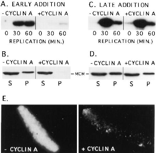 Figure 6. Cyclin A inhibits MCM3 binding to chromatin and blocks DNA replication. (A) Interphase cytosol was preincubated alone (− CYCLIN A) or with 66 nM of cyclin A–GST fusion protein for 30 min. After this preincubation, membrane and sperm (1,000 sperm/μl) were added. Equal volumes of these extracts were removed at the indicated times and labeled with [32P]dATP for 15 min. In extracts lacking added cyclin A, replication occurred normally, while in the presence of cyclin A replication was strongly inhibited. (B) Interphase cytosol was preincubated with or without 66 nM of cyclin A-GST for 30 min. Sperm nuclei were then added to 5,000 sperm/μl. After a further 30-min incubation, the samples were diluted fivefold with ELB and the sperm chromatin separated from the cytosol by centrifugation through a sucrose cushion. The cytosol (S) and chromatin (P) fractions were analyzed for MCM3 content by Western blotting with antiMCM3 antibody. Preincubation of cytosol with cyclin A strongly inhibited the subsequent association of MCM3 with chromatin. (C) Interphase cytosol was first incubated with 1,000 sperm/μl for 30 min. This reaction was then divided in half, and 66 nM cyclin A was added to one aliquot (+ CYCLIN A). Membrane was then added to both halves, and DNA replication was assayed as in (A). Under these conditions cyclin A did not inhibit DNA replication. (D) Interphase cytosol was incubated with 5,000 sperm/μl for 30 min. Either ELB buffer (− CYCLIN A) or 67 nM of cyclin A-GST (+ CYCLIN A) was then added to the reactions. After a further 30-min incubation, samples were collected and analyzed as in B. Under these conditions late addition of cyclin A did not prevent MCM3 from binding to sperm chromatin. (E) The samples were treated as in B above, however, instead of pelleting the sperm after incubation, the chromatin-bound MCM3 was visualized by staining with anti-MCM3 antibody, followed by rhodamine-labeled anti–rabbit IgG. Early addition of cyclin A (+ CYCLIN A) blocked the association of MCM3 with chromatin when compared to controls lacking cyclin A (− CYCLIN A).