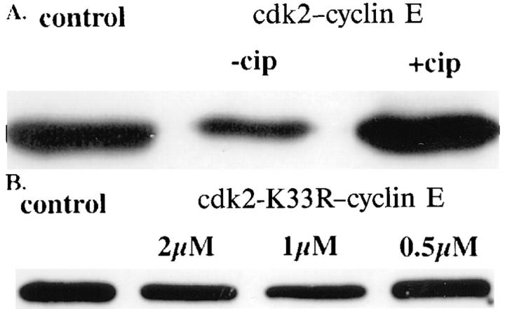 Figure 4. Inhibition of MCM3 binding requires active cdk2– cyclin E kinase activity. (A) 500 nM of cdk2–cyclin E was first incubated with interphase cytosol for 30 min (cdk2–cyclin E). The reaction was then split into two parts, and cip (final 600 nM) was added to one half (+ cip). After a 15-min incubation, sperm was added (final 5,000/μl) to both, and the reactions were carried out for another 30 min. Chromatin-associated MCM3 was analyzed by Western blotting using anti-MCM3 antibody. Control shows the amount of MCM3 bound to chromatin without cdk2– cyclin E treatment. When the kinase activity of cdk2–cyclin E was blocked by cip, it could no longer inhibit MCM3 binding. (B) Interphase cytosol was incubated either alone (control) or with indicated concentrations of cdk2-K33R–cyclin E for 30 min. After this incubation, sperm chromatin was added to 5,000/μl. After being incubated for another 30 min, the sperm was pelleted. MCM3 bound to the sperm chromatin was assayed as in A. cdk2K33R–cyclin E, which is a kinase inactive complex, does not inhibit MCM3 from binding to chromatin.