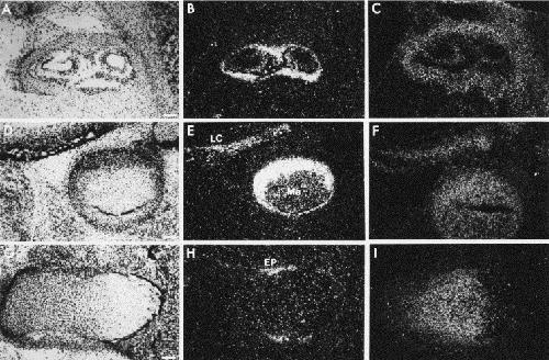 Fig. 8. Localization of mouse fiz mRNA in areas of bone formation of 17.5 dpc embryos. Bright field (A,D,G) and dark field illumination of selected areas of ossification in a 17.5 dpc. mouse embryo probed with 35S-labelled mfiz antisense RNA (B,E,H). Parallel sections probed with mfiz sense RNA are shown in dark field illumination in (C,F,I). In the cochlear capsule (A–C) mfiz mRNA is detected. (D–F) mfiz expression in the lamina cribosa and in the head of the mandible. Mfiz expression in the perichondrium of long bones is increased in the epiphysial growth plate (G–I). Abbreviations: EP, epiphysial growth plate; LC, zygoma; Ma, head of mandible. Bars represent 40 μm.